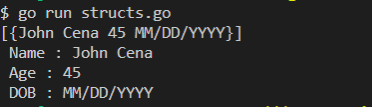 user1:=UserData{firstName:"John",lastName:"Cena",age:45 ,dob: "MM/DD/YYYY" }