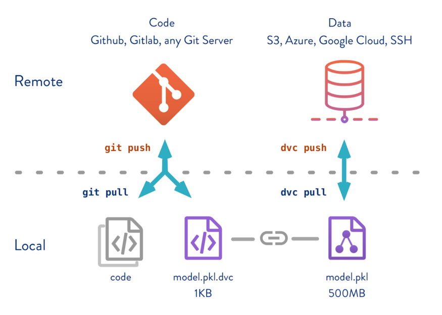 Code versioning is not really a new thing for us because we use Git in our daily life but the problem with Git is it becomes extremely slow when the tracking file size is huge as 100 GB. That is where DVC comes in. Git tracks the changes in code whereas DVC tracks the changes in data as well as models.