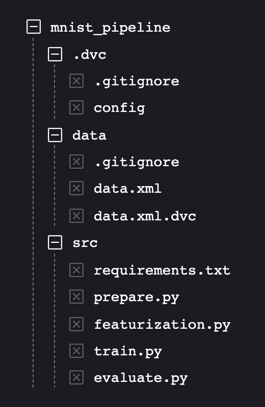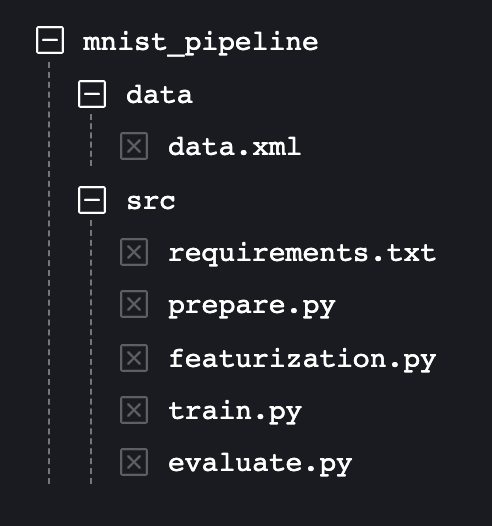 By observing the file structure, we can see the MNIST dataset is stored in the data directory as a data.xml file and the code corresponding to every stage of the pipeline is stored in the src directory. Now as we understand, the code tracking (src) is the responsibility of Git and the data tracking (data) is the responsibility of DVC.