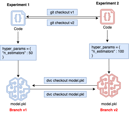 Let us suppose we are working in Git branch v1 where the hyper-parameter n_estimators to train model has value 50 and we have trained a model which is stored as model.pkl. Now, we want to experiment with value 100 for the same hyper-parameter n_estimators. So, we don't need to rename the old model file anymore. We will switch to another Git branch v2 using git checkout v2 command and we will switch to different model file version using dvc checkout model.pkl. We will change the value of hyper-parameter n_estimators to 100 now in code in v2 branch and we can train the model again. The new model.pkl file generated in v2 branch is corresponding to n_estimators = 100 and model.pkl file in v1 branch is corresponding to n_estimators = 50.