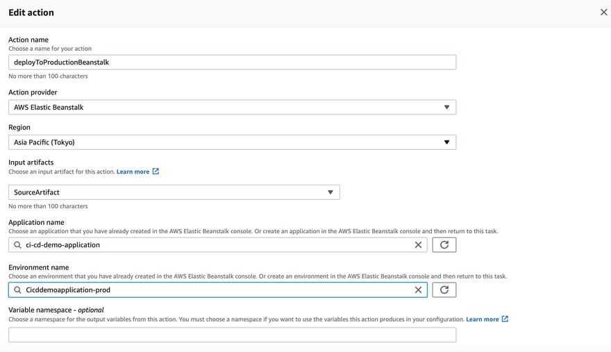 Configure the deploy stage for the pipeline as the elastic beanstalk and the sample application created earlier.