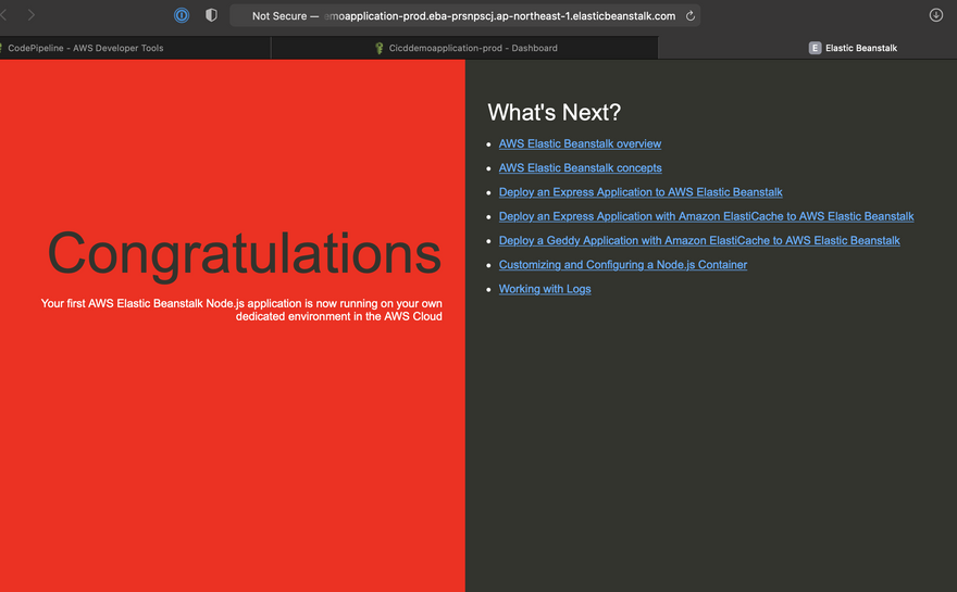 The moment the pipeline is created, it triggers the pipeline and deploys automatically the index.html contents to the elastic beanstalk application.