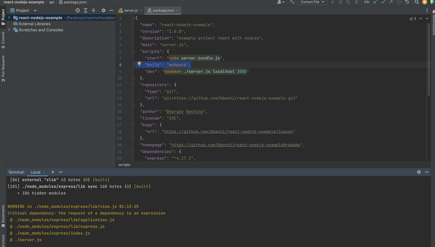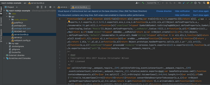 Note: React code needs to be bundled, transpilled, and compressed. A tool called webpackwhich produces server.bundle.js