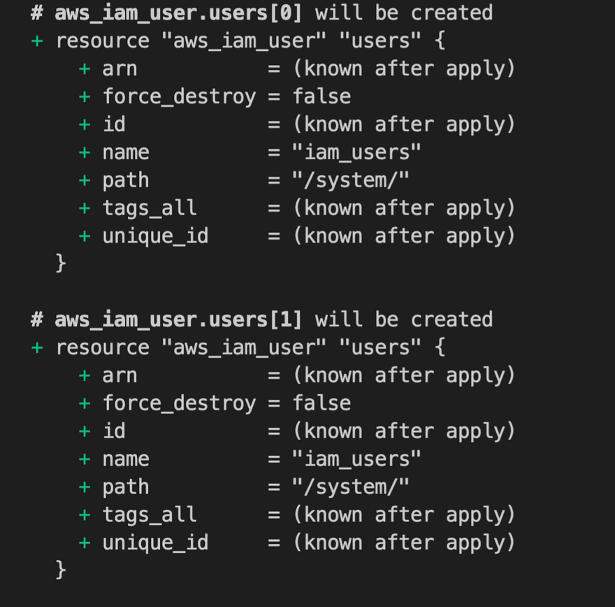 - This results in 3 iam users with the name iam_users.1, iam_user.2.