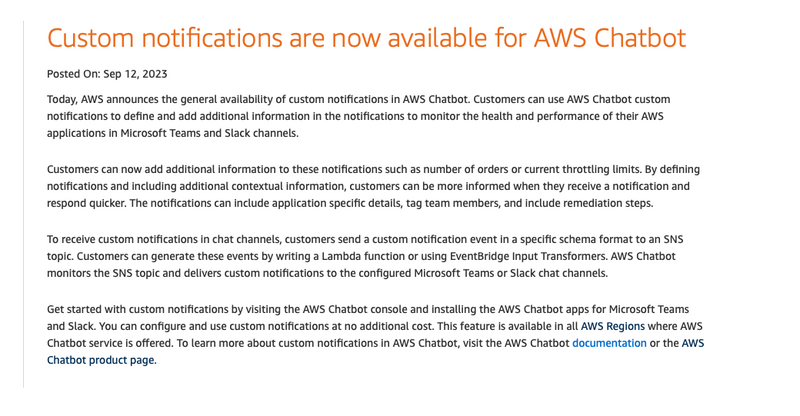 Until now, there was a limitation that notifications from aws chatbot could not be customised, additional information in the notifications