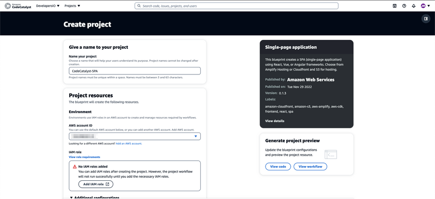 CodeCatalyst project consists of blueprints which setup new software development projects without any human effort, including CI/CD, deployable code, issue tracking, and AWS services (IAM roles and policies) configured according to best practices.