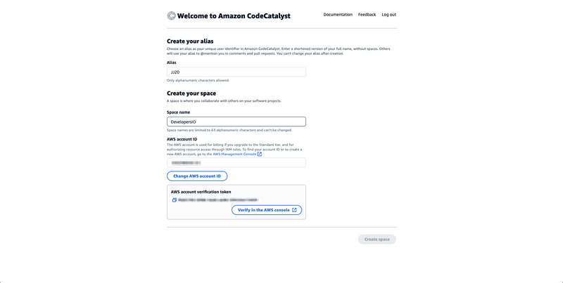 Set up an alias for CodeCatalyst. This is a unique identifier in CodeCatalyst. People will use this alias to mention in comments and pull requests.