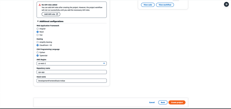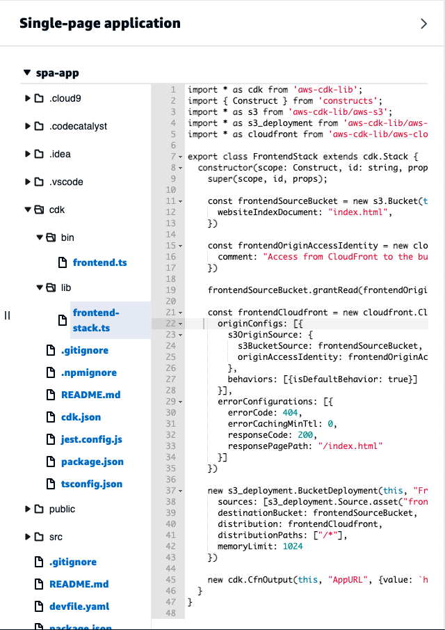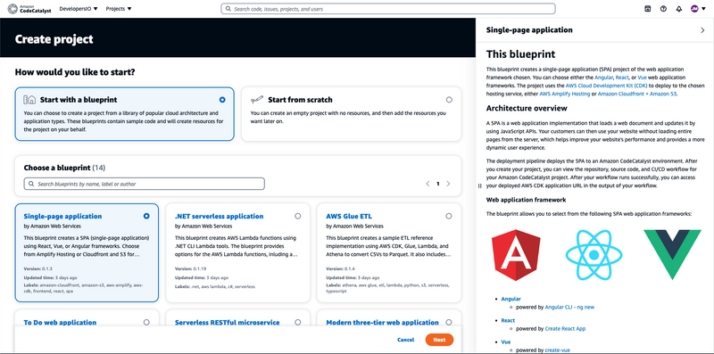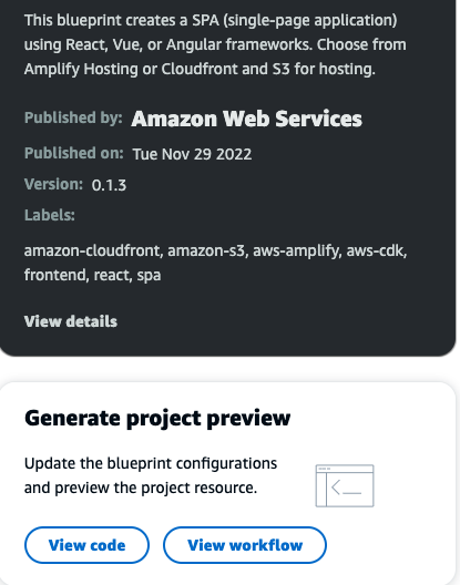 This particular blueprint This blueprint creates a single-page application (SPA) project of the web application framework chosen. You can choose either the Angular, React, or Vue web application frameworks. The project uses the AWS Cloud Development Kit (CDK) to deploy to the chosen hosting service, either AWS Amplify Hosting or Amazon Cloudfront + Amazon S3.