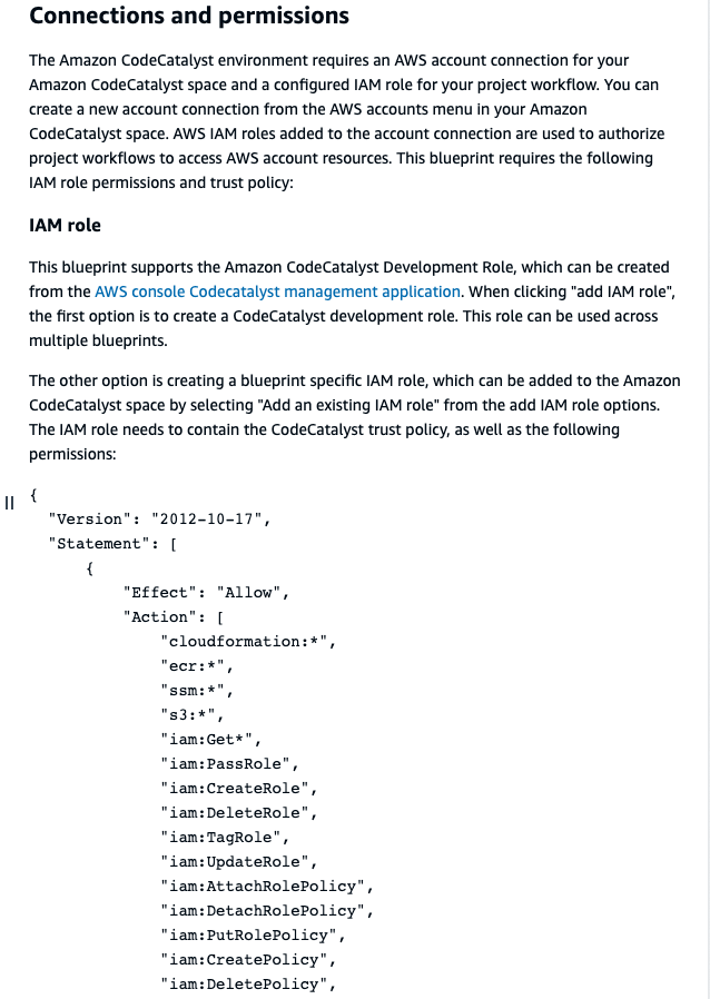 • After selecting the blueprint you can know more about it on the right pane. What does it do, about its architecture, which aws service components are being used and their explanation, about the IAM role, its permissions and trust policy it needs, account connections environment needs, and what resources it will create?
