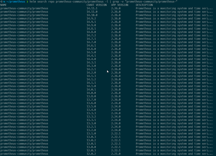 helm search repo prometheus-community/prometheus -l | grep -v "community-prometheus/prometheus-"