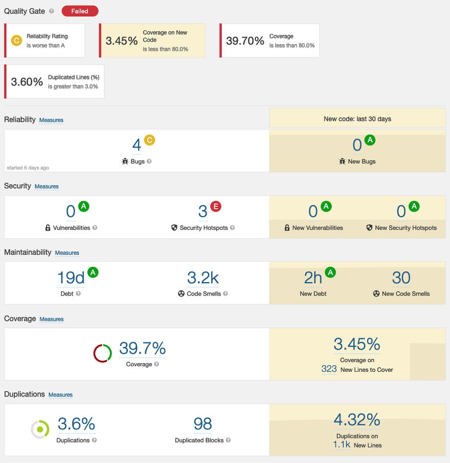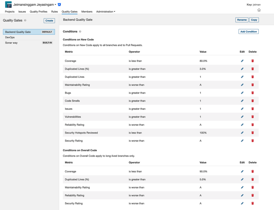 A quality gate is technically a metric of sorts that informs you whether your code meets a minimum level of quality required for the project. This consists of a set of conditions that are applied to the results of each analysis performed. If the results meet or exceed the quality gate conditions, it will show one of the following statuses accordingly: Passed or Failed. You can define conditions on New Code and Overall Code. Some examples of the conditions are: