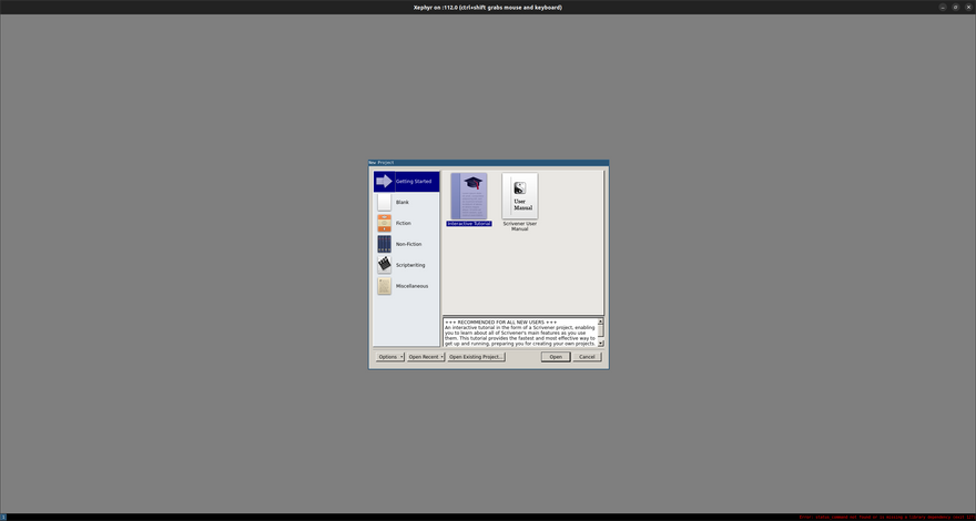 I came across this fantastic post about running Scrivener on Ubuntu. There was a beta of a Linux release of the software a number of years ago, and according to the above post, it still works really well on Ubuntu 22.04, so I thought I'd give it a try, however, I wanted to run it in a Docker container (since it had a number of dependency packages I would be using nowhere else) and launch as a desktop app with x11docker, for example, or [configuring the system display to launch application windows)(https://blog.jessfraz.com/post/docker-containers-on-the-desktop/).