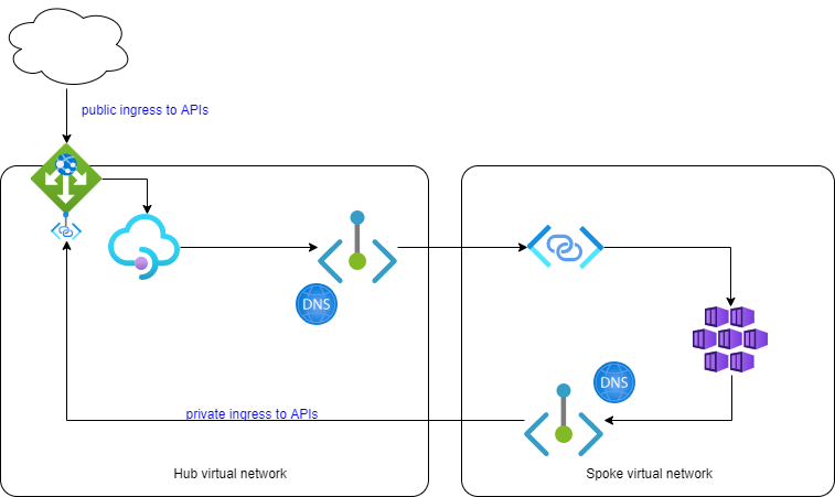 One challenge that had to be solved back then is how to let the workloads running in Azure Container Apps environment call back into an API Management instance in the Hub virtual network. To achieve that I private linked the Application Gateway, that forwards to the API Management instance, into the Spoke virtual network: