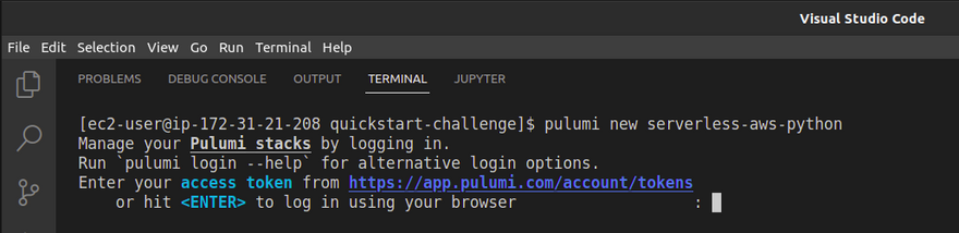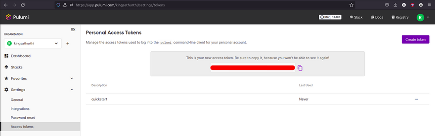 Once you ran the above command it will ask for access token please login to your pulumi account and create token and save it safely.