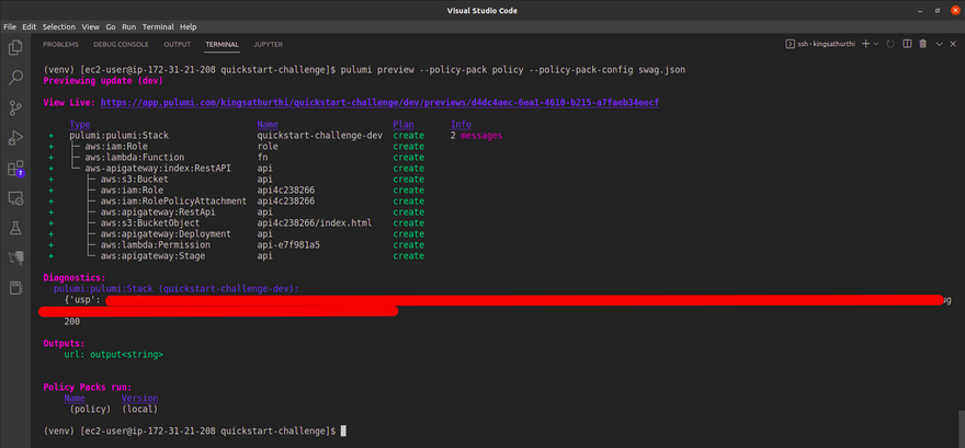 Execute your policy pack against your Pulumi Program with the following command at the root of your project to submit for your swag