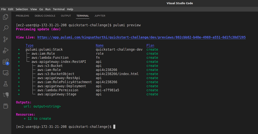 If you see the output for the pulumi preview command it create the IAM role, Lambda Function, S3 Bucket, API gateway under the hood.