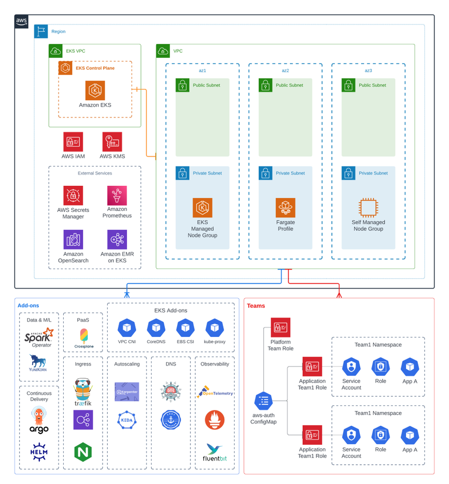 EKS Blueprints is a collection of Infrastructure as Code (IaC) modules that will help you configure and deploy EKS clusters across accounts and regions. You can use EKS Blueprints to easily bootstrap an EKS cluster with Amazon EKS add-ons as well as a wide range of popular open-source add-ons, including Prometheus, Karpenter, Nginx, Traefik, AWS Load Balancer Controller, Fluent Bit, Keda, Argo CD, and more. EKS Blueprints also helps you implement relevant security controls needed to operate workloads from multiple teams in the same cluster.
