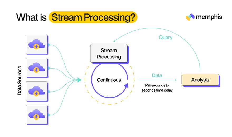 Stream processing is a type of data processing that involves continuous, real-time analysis of data streams. It is a way of handling large volumes of data that are generated by various sources, such as sensors, financial transactions, or social media feeds, in real-time.