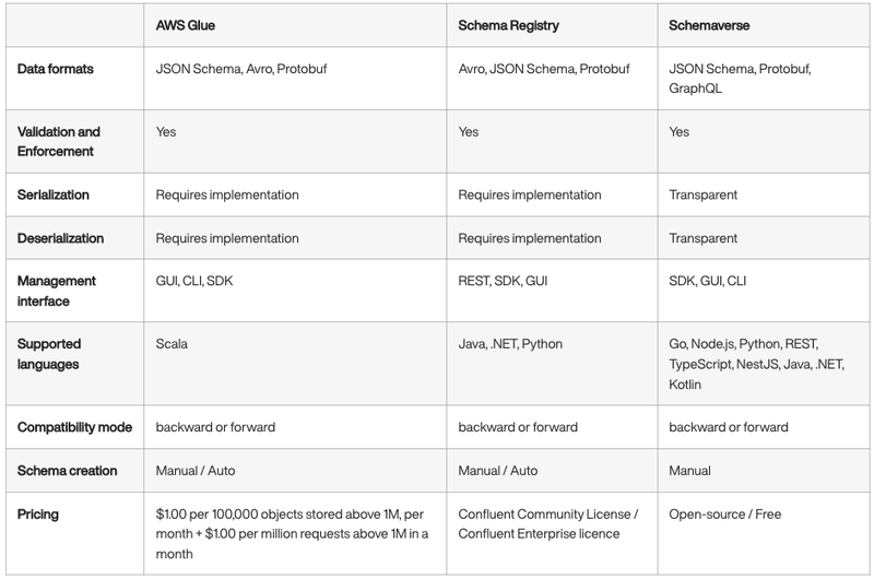In AWS Glue and Schema Registry, It is the client responsibility to implement and deal with the serialisation while in Schemaverse it is fully transparent and all is needed by the client is to produce a message that complies with the required structure.