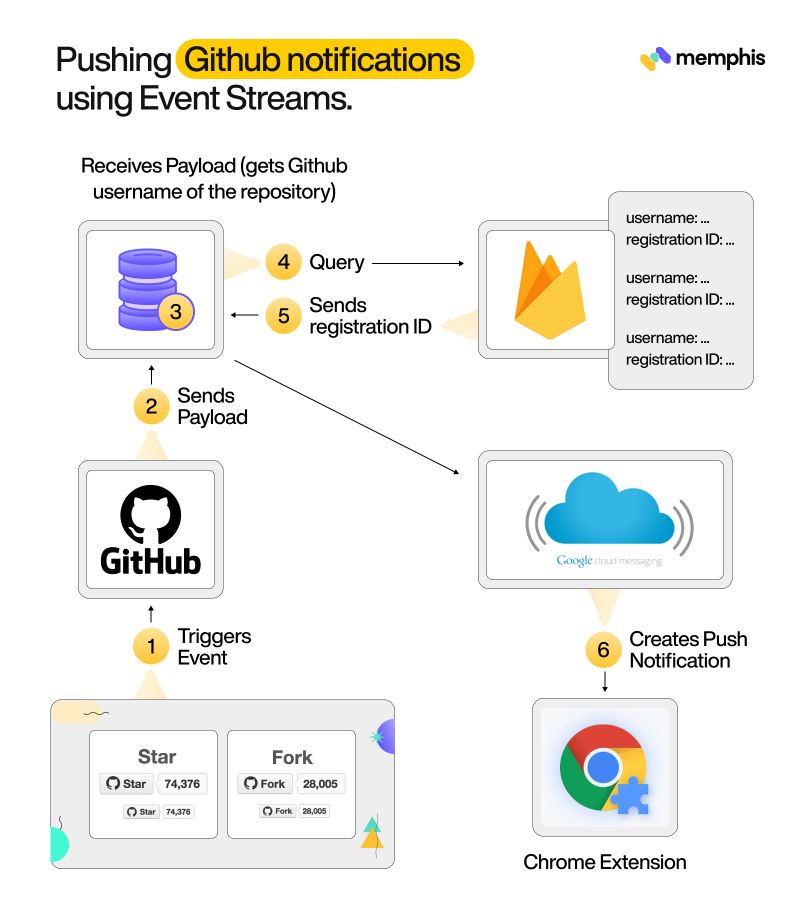 Here we are taking an example of creating a chrome extension that makes use of event dreams to provide real-time GitHub push notifications.