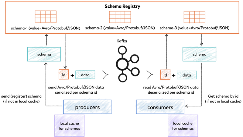 Confluent Schema Registry provides a serving layer for your metadata. It provides a RESTful interface for storing and retrieving your Avro®, JSON Schema, and Protobuf schemas. It stores a versioned history of all schemas based on a specified subject name strategy, provides multiple compatibility settings, and allows the evolution of schemas according to the configured compatibility settings and expanded support for these schema types. It provides serializers that plug into Apache Kafka® clients. They handle schema storage and retrieval for Kafka messages that are sent in any of the supported formats.