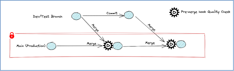 - Suppose the schema of incoming data is different from that of production data, the configured lakeFS hooks will be triggered on pre-merge condition, and hooks will fail the merge operation to master branch.
