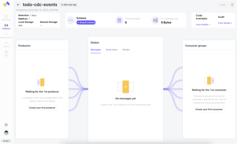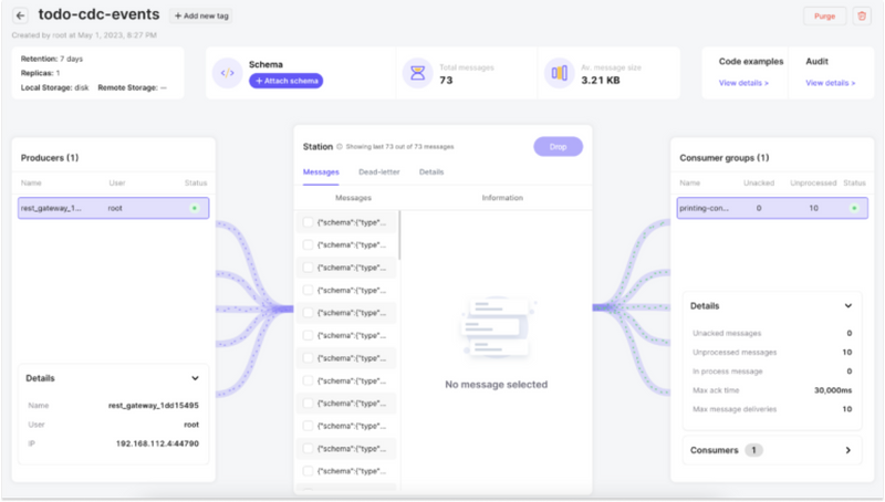 Check the todo-cdc-events station overview screen in Memphis.dev web UI to confirm that the producer and consumer are connected and messages are being delivered.