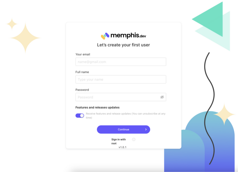 Messages are delivered to “stations” in Memphis.dev; they are equivalent to “topics” used by message brokers. Point your browser at http://localhost:9000/. Click the “sign in with root” link at the bottom of the page.