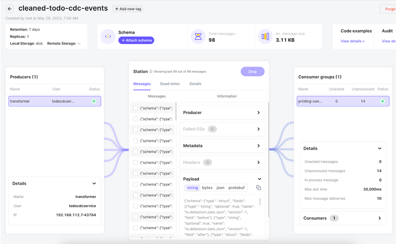Transformer Service: A transformer service that consumes messages from the todo-cdc-events station, deserializes the MongoDB records, and pushes them to the cleaned-todo-cdc-events station.