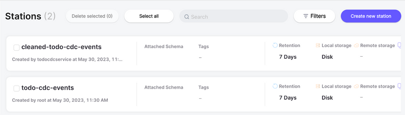 Memphis.dev: Configured with a single station (todo-cdc-events) and single user (todocdcservice).