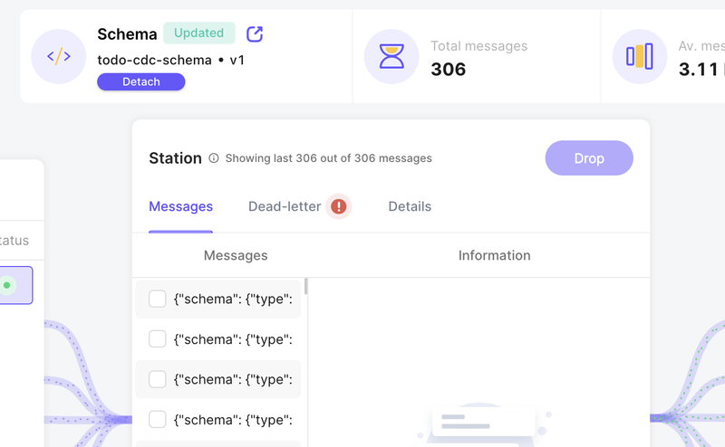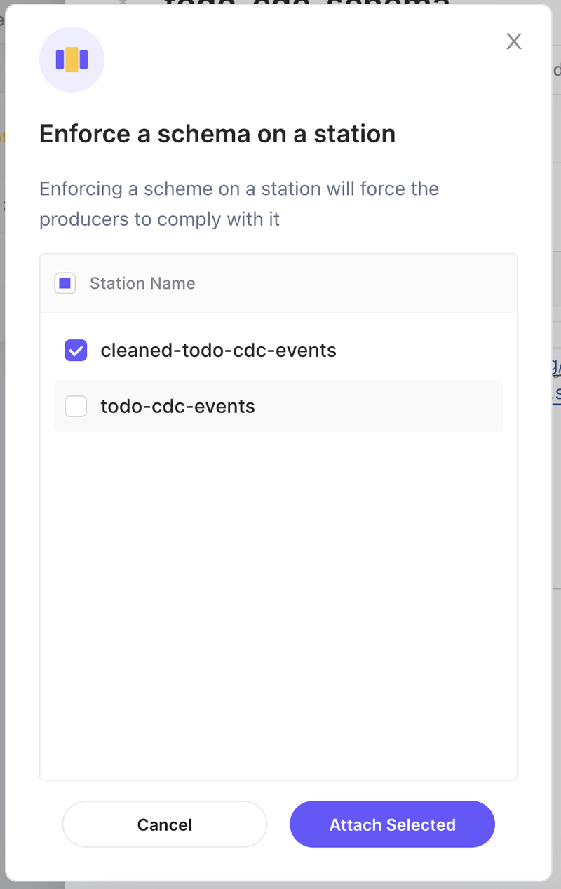 Select the "cleaned-todo-cdc-events" station, and click "Attach Selected." The producers attached to the station will automatically download the schema and begin validating outgoing messages within a few minutes.