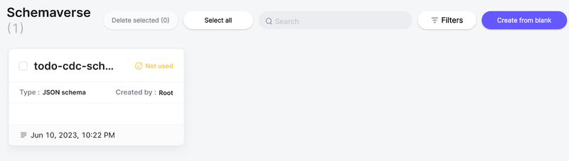 Click the "Create from blank" button to create a new schema. Set the schema name to "todo-cdc-schema" and the schema type to "JSON schema." Paste the following JSON Schema document into the textbox on the right.