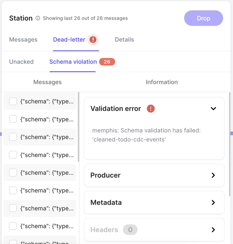 If you click on the "Dead-letter" tab and then the "Schema violation" subtab, you'll see the messages that failed the schema validation. These messages have been re-routed to the dead letter queue so that they don't cause bugs in the downstream pipelines. The window will look like so: