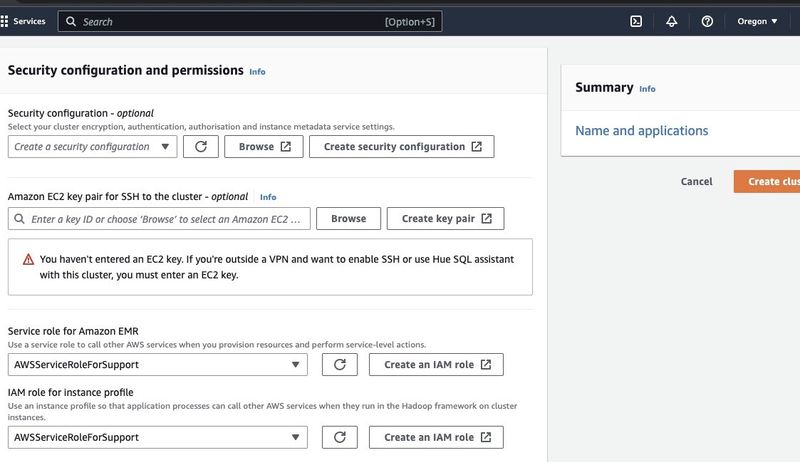 Go to the “Security configuration and permissions section” and input your EC2 key pair or go with the option to create one.