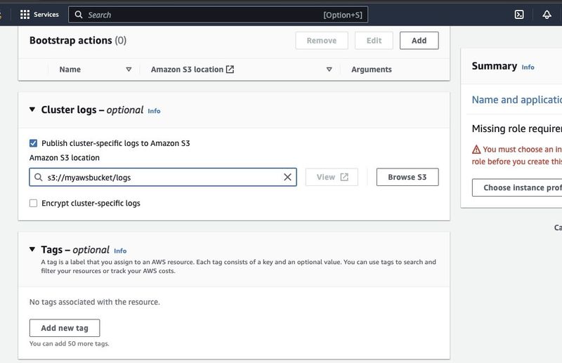 Scroll down to the "Cluster logs" section and select the checkbox of Publish cluster-specific logs to Amazon S3.