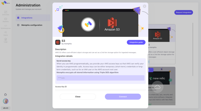 Enable AWS S3 integration via the Memphis integration center