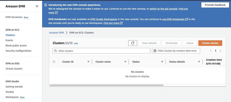 The Amazon Elastic MapReduce (EMR) is a web service based on Apache Hadoop that allows users to cost-effectively process vast amounts of data using big data technologies including Apache Spark. To create an EMR cluster with Spark installed, open the EMR console at https://console.aws.amazon.com/emr/ and select "Clusters" under "EMR on EC2" on the left side of the page.
