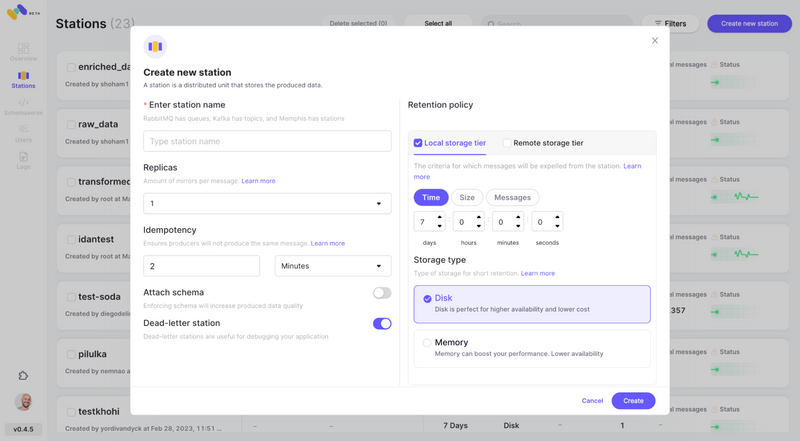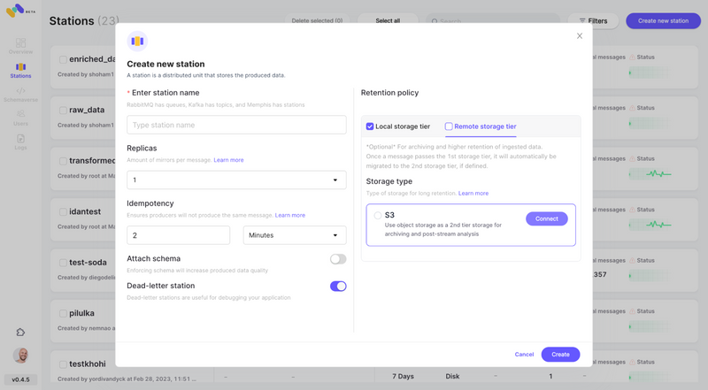 - Create a station (topic), and choose a retention policy. Each message passing the configured retention policy will be offloaded to an S3 bucket.