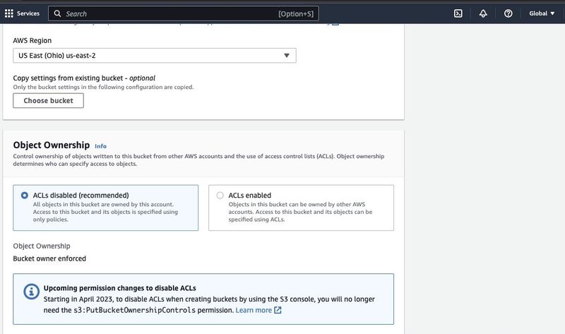 Then proceed to create a bucket name complying with the naming convention and choose the region where you want the bucket to be located. Configure the “Object ownership” and “Block all public access” to your use case.