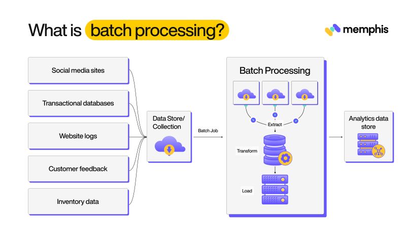 Batch processing is a method to process large volumes of data in batches and this is done at a specific scheduled time. Data is collected over a period of time and at a specific time interval it is processed and output data is sent to other systems or stored in a data warehouse. The size of data in batch processing is known.
