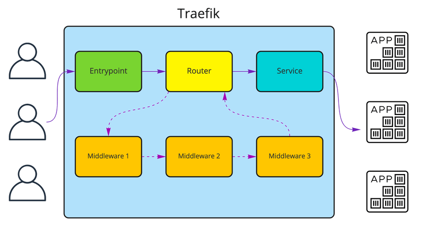 Simplifying a bit, Traefik is built of four main concepts: entrypoint, router, middleware and service. You can configure it to listen on certain entrypoints (ports, example TCP/HTTP on port 80), then the incoming request is matched to a route, each request can go through middleware (or a couple of them) - ex. path rewrite, compression, etc.; to finally reach a configured service that was assigned to the matched route. Services will usually map to your app web server.