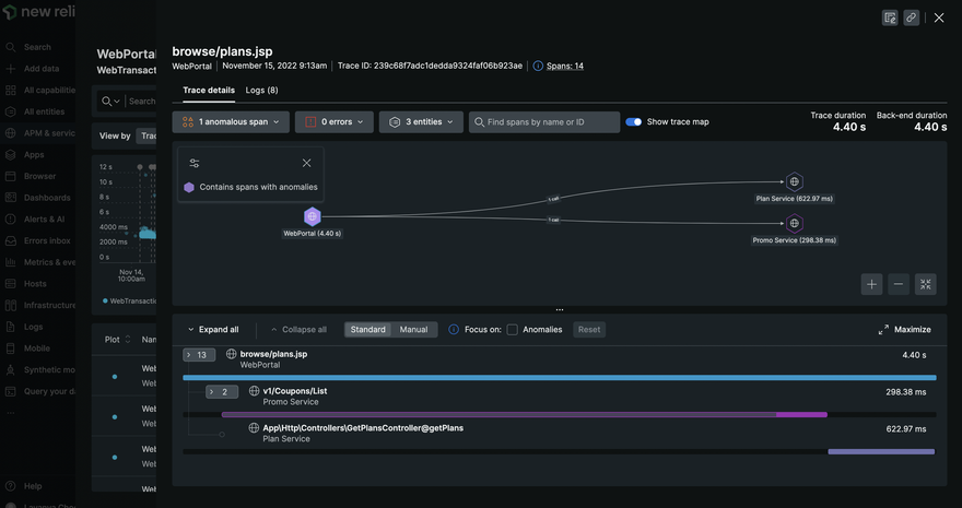 Our new service map shows your grouped entities in a simple, three-tiered view. Identify whether your UX, services, or infrastructure entities have anomalies at a glance. You can also easily check your entity's overall health and golden metrics with our updated tooltip.