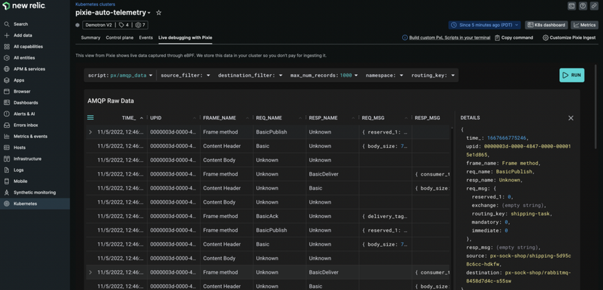 Get deeper insight into your Kubernetes clusters and workloads by understanding the AMQP (Advanced Message Queuing Protocol) messages being transmitted between your services. Get fine-grained telemetry data—service-level metrics, unsampled requests, and more. No language agents required!