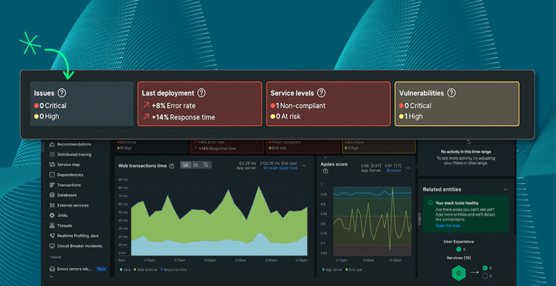 The application performance monitoring (APM) summary tiles provide a comprehensive picture of the service's most important health indicators all in one place so you can identify emerging issues and troubleshoot faster.