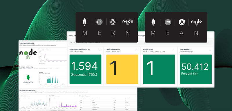 MERN (comprised of MongoDB, ExpressJS, ReactJS, and NodeJS) and MEAN (comprised of MongoDB, ExpressJS, Angular, and NodeJS) are popular JavaScript-based stacks for developing web apps. No matter your frontend framework, easily monitor your stack of choice with the MERN and MEAN quickstarts. They bundle out-of-the-box dashboards and alerts so you can start in minutes.
