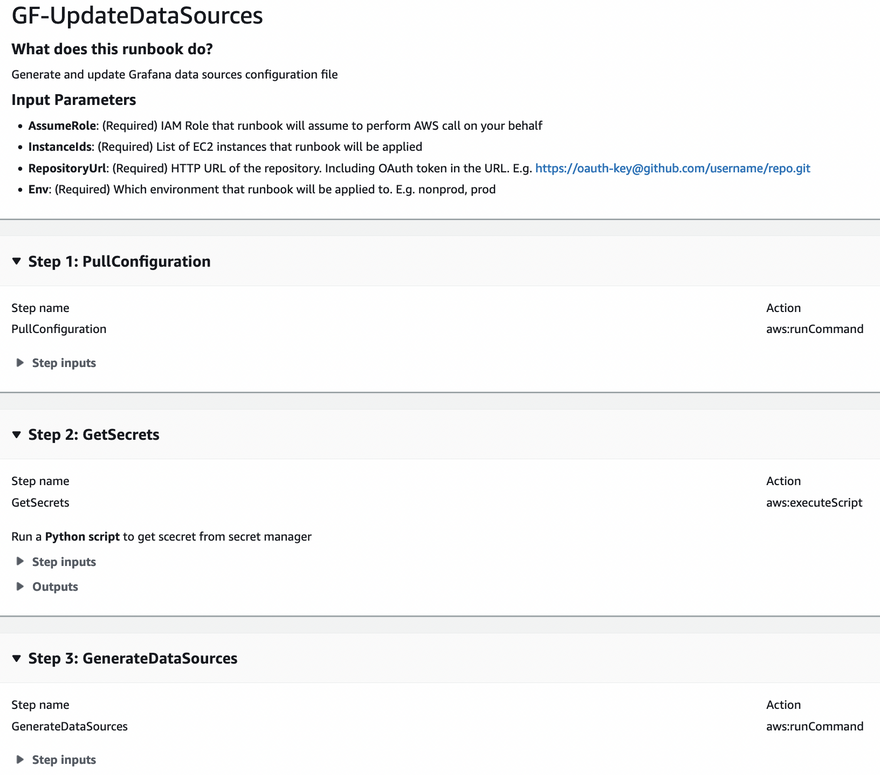 Step #3 in the runbook, I also write a small Python script to combine data source files in the repository into Grafana data source provisioning file, and also replace secret holders by the secret values from Secret Manager.