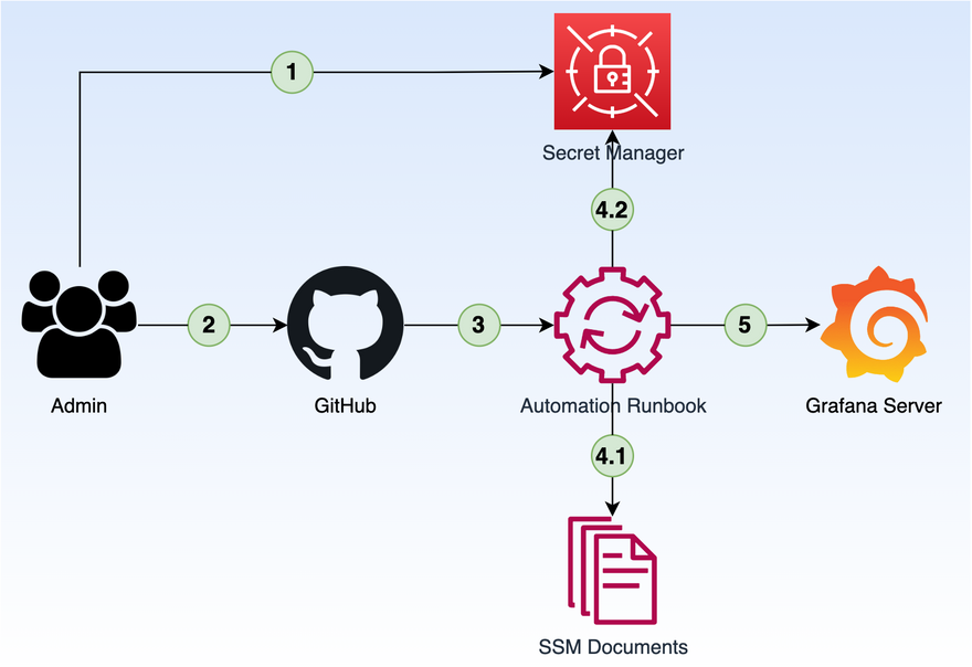 - Runbook executes steps from SSM Documents and gets secrets from Secret Manager