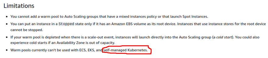 The most naïve way of implementing support for warm pools is to do nothing more than creating the warm pool. Unfortunately, this would start kubelet, which will register the Node with the cluster. Since the AWS cloud provider does not remove instances in stopped state, the control plane marks the Node NotReady, but keep it around in case it comes back up.
