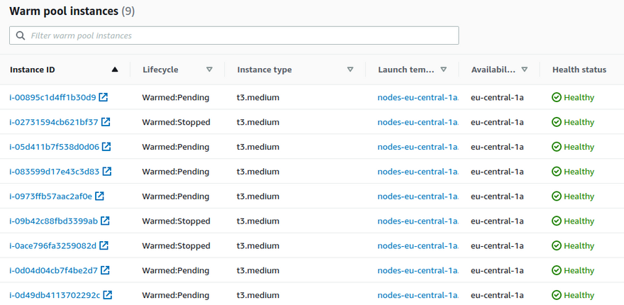 As you can see, not all instances have entered warmed:stopped state yet. But after waiting a bit longer, they are all ready and I can scale out.