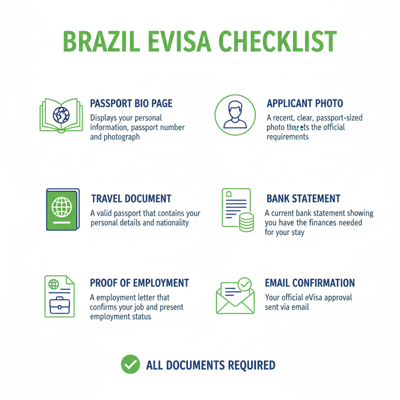 - Recent passport photo as per Brazil's eVisa photo guidelines.